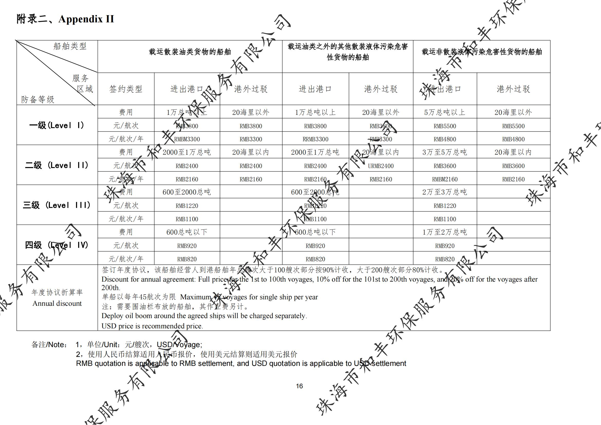 珠海市和豐環保服務有限公司船舶污染物清除協議待命費